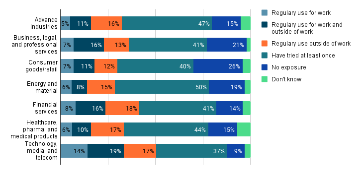 Lonjakan adopsi AI ini, yang disorot oleh McKinsey & Company, tidak terbatas pada ranah teknologi saja; ia meluas hingga mencakup berbagai fungsi bisnis, menandai integrasi signifikan AI ke dalam struktur organisasi itu sendiri. Di luar ranah teknologi konvensional, data dari McKinsey & Company mengungkapkan pergeseran yang signifikan dalam penggunaan AI generatif (gen AI), dengan 24% eksekutif tingkat C-level ternyata secara aktif menggunakan gen AI dalam tanggung jawab harian mereka. Wawasan dari Forbes, yang digabungkan dengan data McKinsey, menegaskan komitmen strategis di jajaran tertinggi organisasi, di mana para pengambil keputusan tingkat atas mengakui kemampuan transformasional dari gen AI, menandakan sebuah perubahan dari AI yang hanya berada di tangan para ahli teknis.