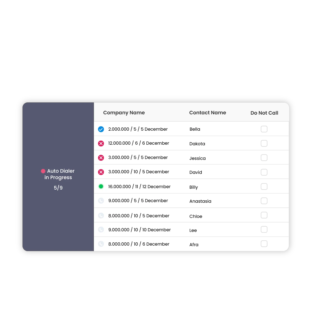 Setelah melakukan panggilan dan mendapat hasil tertentu (misalnya pembayaran berhasil atau nasabah tidak dapat dihubungi kembali), agent dapat langsung menandai nomor tersebut dengan fitur “Do Not Call”. Ini memastikan nomor yang sama tidak dipanggil berulang kali secara tidak perlu.