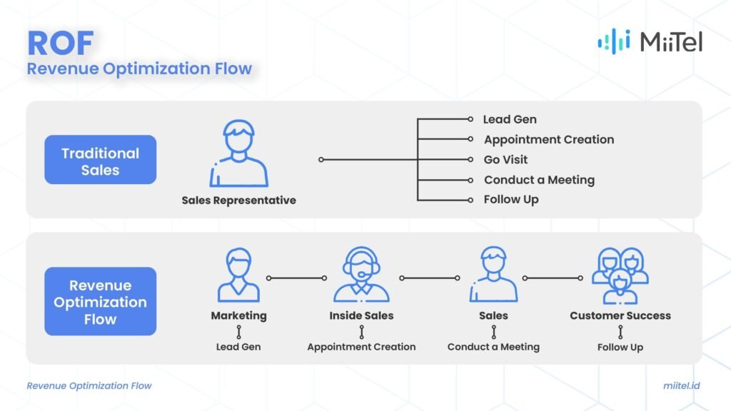 Revenue Optimization Flow adalah pendekatan transformatif yang menjadi strategi RevComm untuk meningkatkan produktivitas bisnis. Berbeda dengan cara kerja Sales tradisional, RevComm membagi divisi Sales menjadi tiga bagian khusus, yaitu Inside Sales, Sales Representative, dan Customer Success. Masing-masing bagian memiliki peran khusus dalam meningkatkan efisiensi proses penjualan.