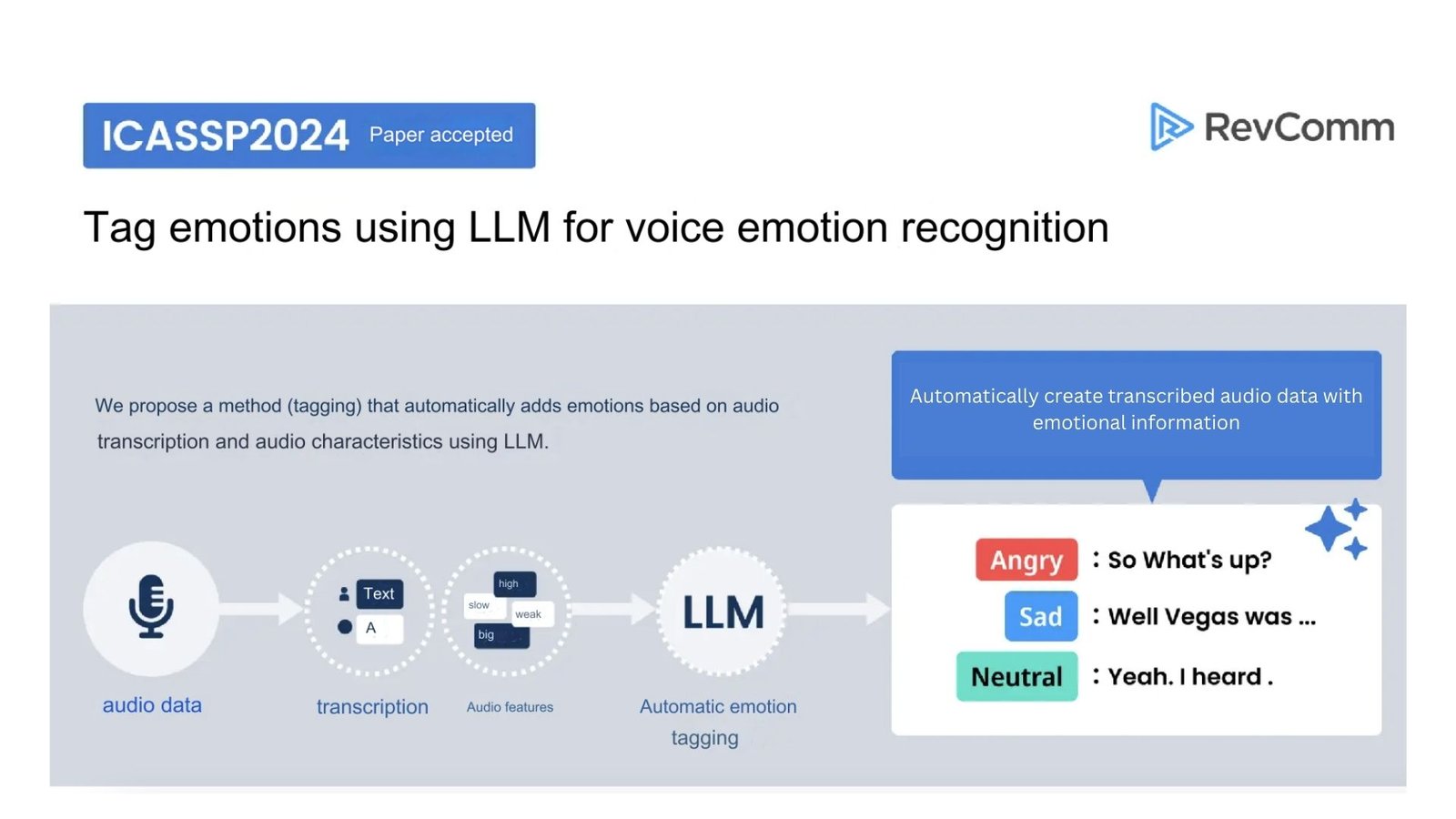 Jakarta, 1 April 2024 – RevComm dengan bangga mengumumkan bahwa tim Research and Development RevComm Inc, RevComm Research, terpilih untuk mempresentasikan penelitiannya dalam Konferensi Internasional Acoustics, Speech and Signal Processing, ICASSP 2024.