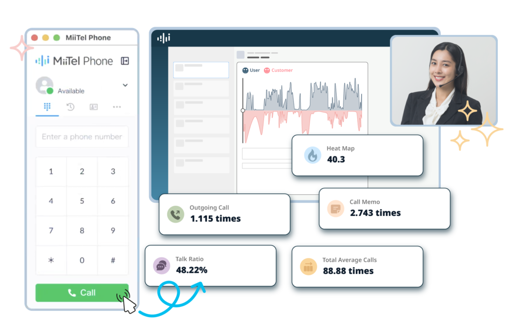 MiiTel secara otomatis merekam, mentranskripsi, membuat summary, dan menganalisis performa percakapan telepon dan meeting, seperti kecepatan berbicara, intonasi, frekuensi kata-kata yang sering diucapkan, analisis sentimen, dan berbagai metrik lainnya.
